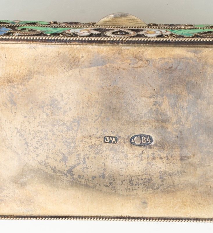 rettangolare in argento dorato e smalti cloisonné, caratterizzata sul coperchio da una miniatura raffigurante uncCremlino animato da numerosi personaggi con cattedrale sullo sfondo Bollo della città di Mosca e dell'Atelier 3° artels (1908).