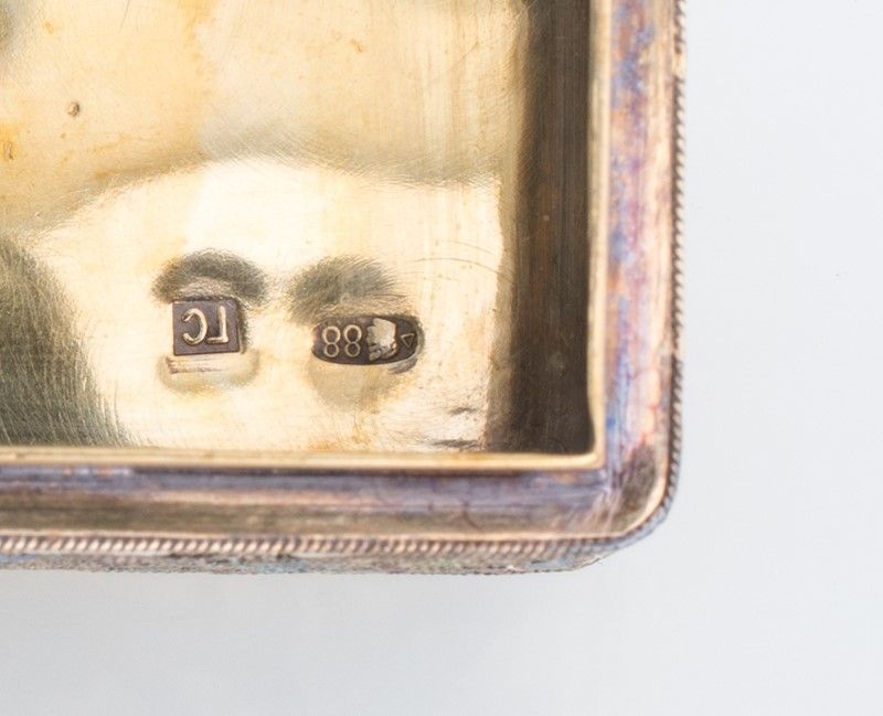 rettangolare in argento e smalti policromi cloisonné; con coperchio incernierato reca decorazione ad ampie volute e motivi stilizzati su fondo crema Bollo della città di Mosca, orafo Grigorij Ivanov Gerebryanikov. Punzone di titolo 88 zolotnik equivalente a 916,67/1000.
