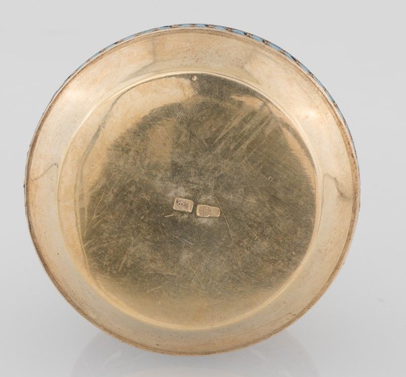 in argento dorato di forma circolare a fascia concava e decorazione minima in forma di virgole contrapposte in smalti policromi cloisonné.. Bollo della città di Mosca, maestro orafo Unkurov 1818.