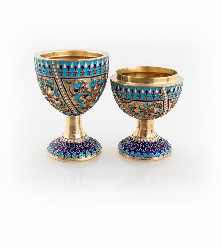 in argento dorato e smalti policromi cloisonné, ad uso di portauovo alla coque. Bollo della città di Mosca, orafo Gregorij Sbitsen.
