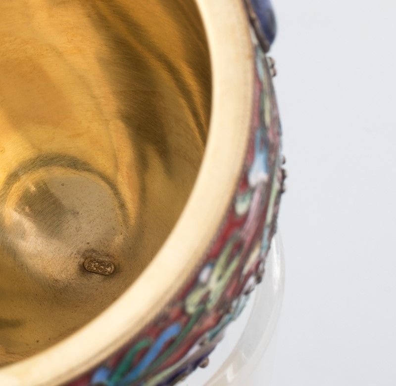 sorretto da tre piedi è decorato a motivi floreali su fondo rosso ed è arricchito da gemme cabochon in pietra dura semipreziosa. Bollo della città di San Pietroburgo, orafo Antip Kuzmichev (1856-1897).