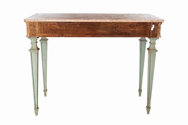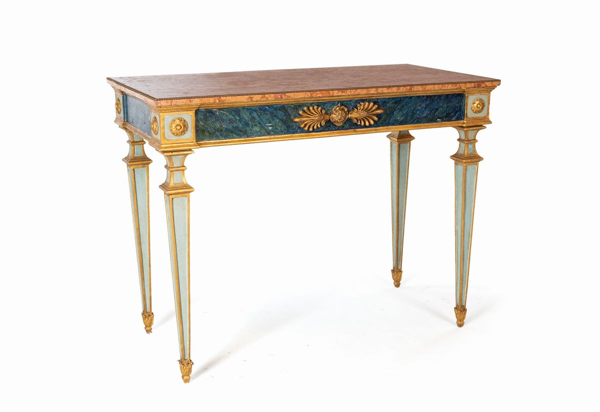 dorata lungo i profili ed i rilievi ornamentali; piano rettangolare in marmo profilato da perlinatura in bronzo, fascia lineare dipinta ad imitazione del marmo, gambe rastremate con attacchi a rocchetto e puntali intagliati in forma di cespo fogliaceo.
