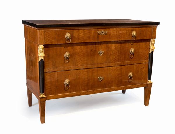 con tre cassetti frontali delimitati da lesene semicircolari ebanizzate sormontate da figure di cariatide intagliate e dorate; piedi rastremati.