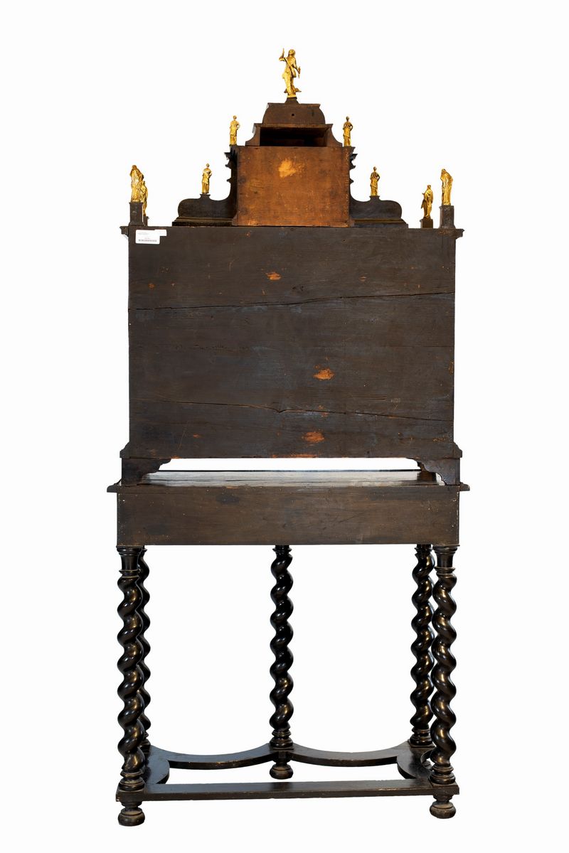 con facciata di impostazione architettonica centrata da nicchia affiancata da tiretti in colonna; sulla sommità figure scultoree in bronzo dorato; base con gambe tortili riunite da traverse.