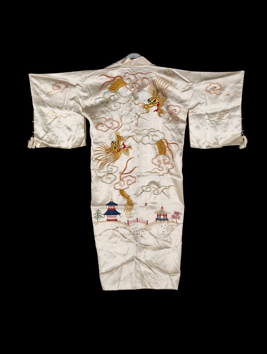 ricamato in vivace policromia con un paesaggio minimo con architetture e due grandi figure di drago ricamate in rilievo con fili dorati circondati da nuvole; due nappe pendenti lungo l'orlo delle maniche, obi in velluto rosso.