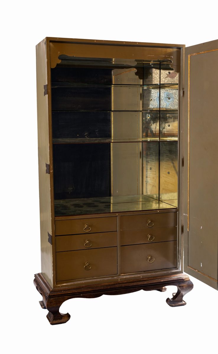 abbellito da un pannello con vaso di peonie dipinto posto ad ornamento dell'anta frontale; all'interno ripiani sagomati in cristallo e fodere rivestite di specchio. Difetti.