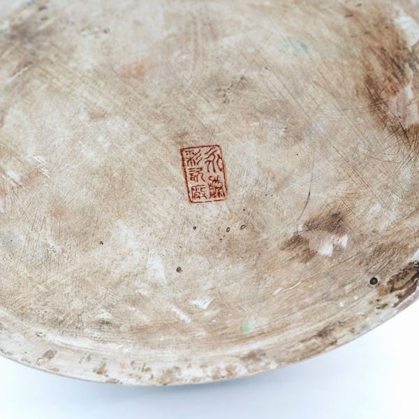 decorato in vivace policromia con figure di cortigiane e dignitari ambientati in scorci con architetture; bordure con fitta decorazione su fondo oro delimitano la scena.