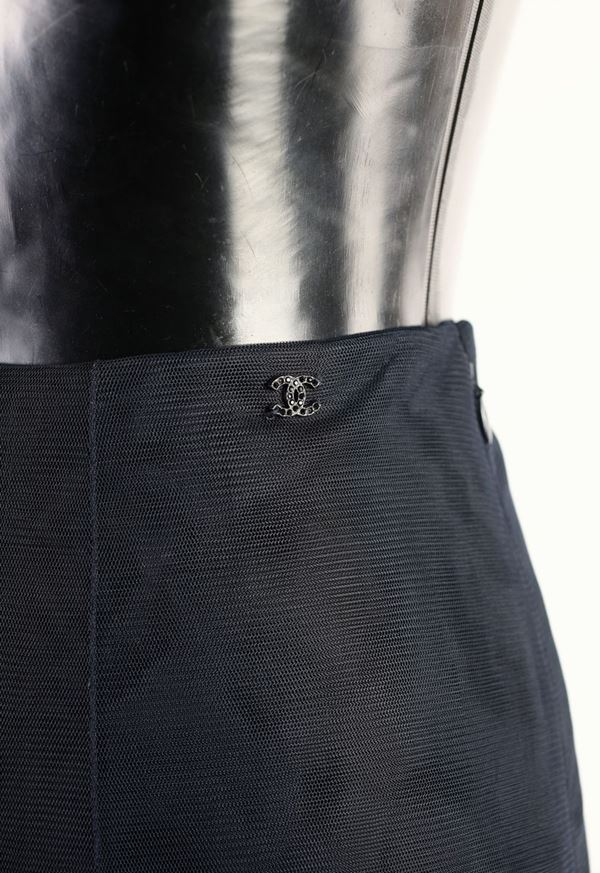 Blu notte, taglia 42, fodera in seta. Chiusura con zip invisibile e placca con logo cc sul fianco. Ottimo stato di conservazione.