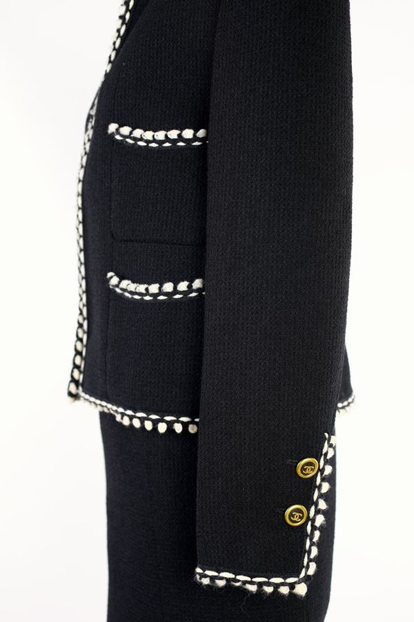 Giacca e gonna taglia 40. In lana, fodera logata cc in seta. Giacca senza chiusura con catenina oro nella finitura interna e bottoni con logo sulle maniche. Ottimo stato di conservazione.