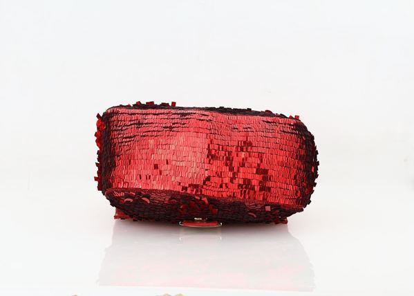 In paillettes multiformi rosse e manico in pelle (54cm). Chiusura con logo e bottone magnetico. Fodera in raso viola. Ottimo stato di conservazione.