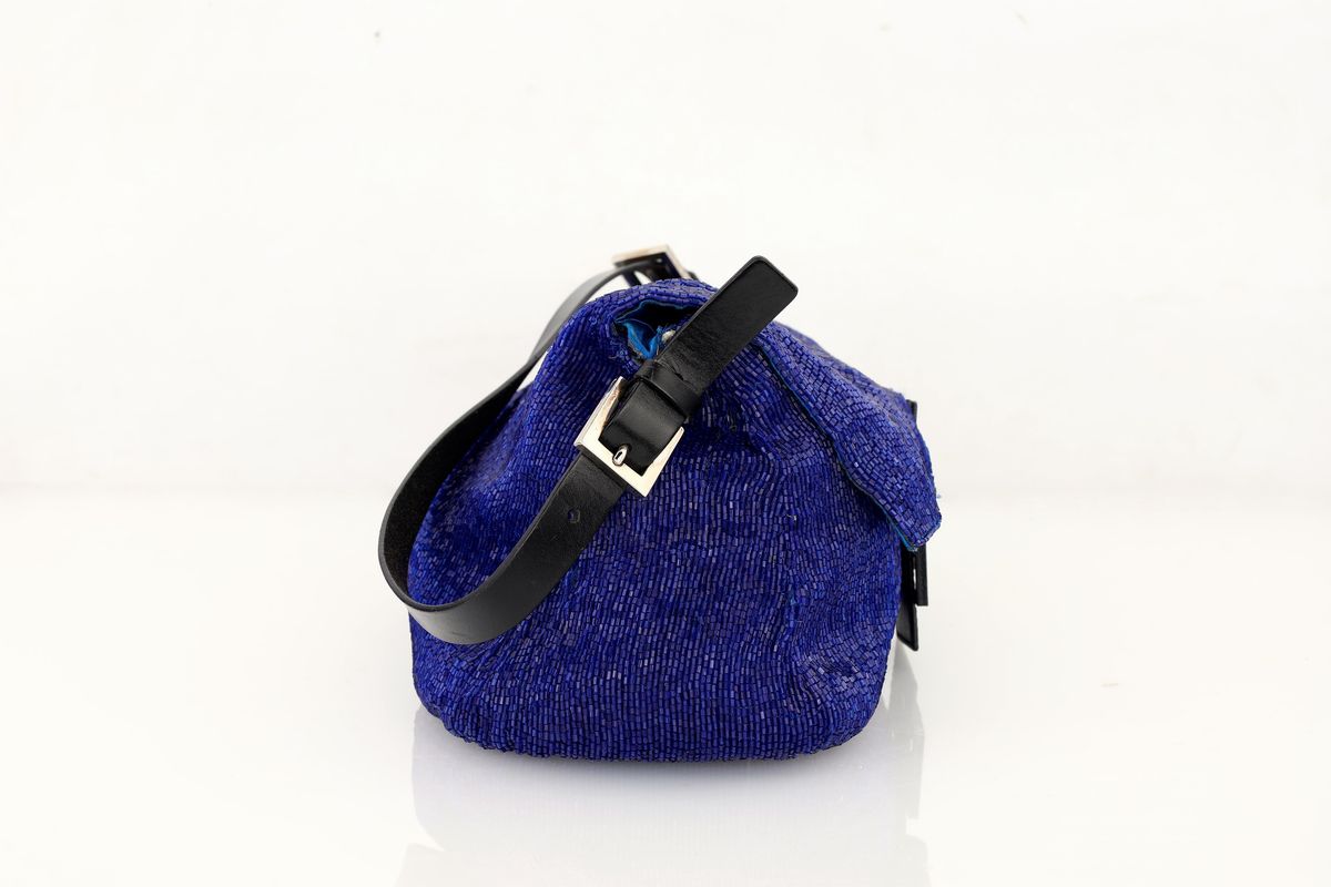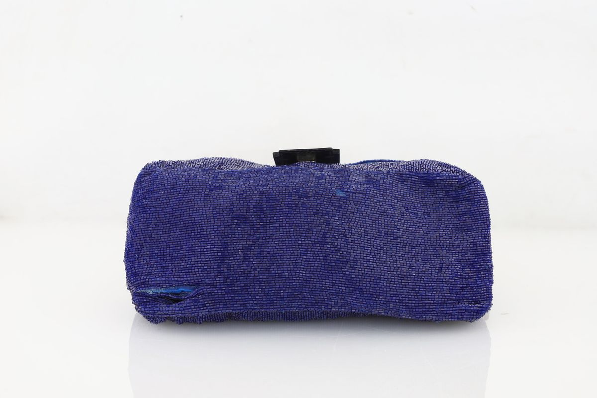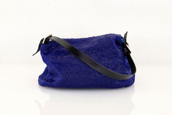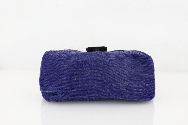 manico in pelle nera (46cm), chiusura in pelle con logo e bottone magnetico. Interno in raso color bluette. Necessita di riparazione.