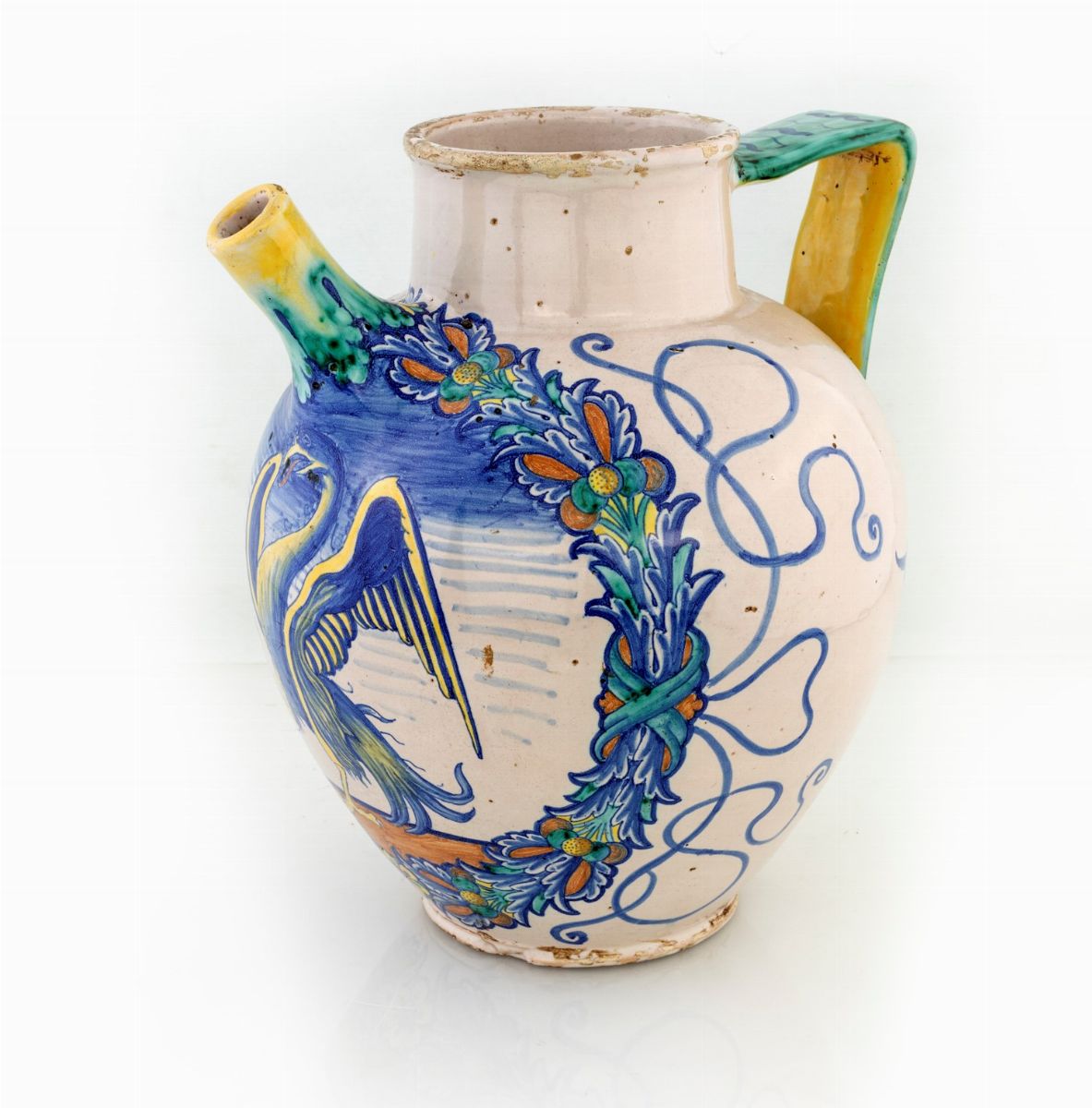 con versatoio cilindrico e manico a nastro, decorata nei toni del blu, verde e giallo con iscrizione "da captolicon" ed un grande cartiglio definito da ghirlanda ad incorniciare un uccello fantastico