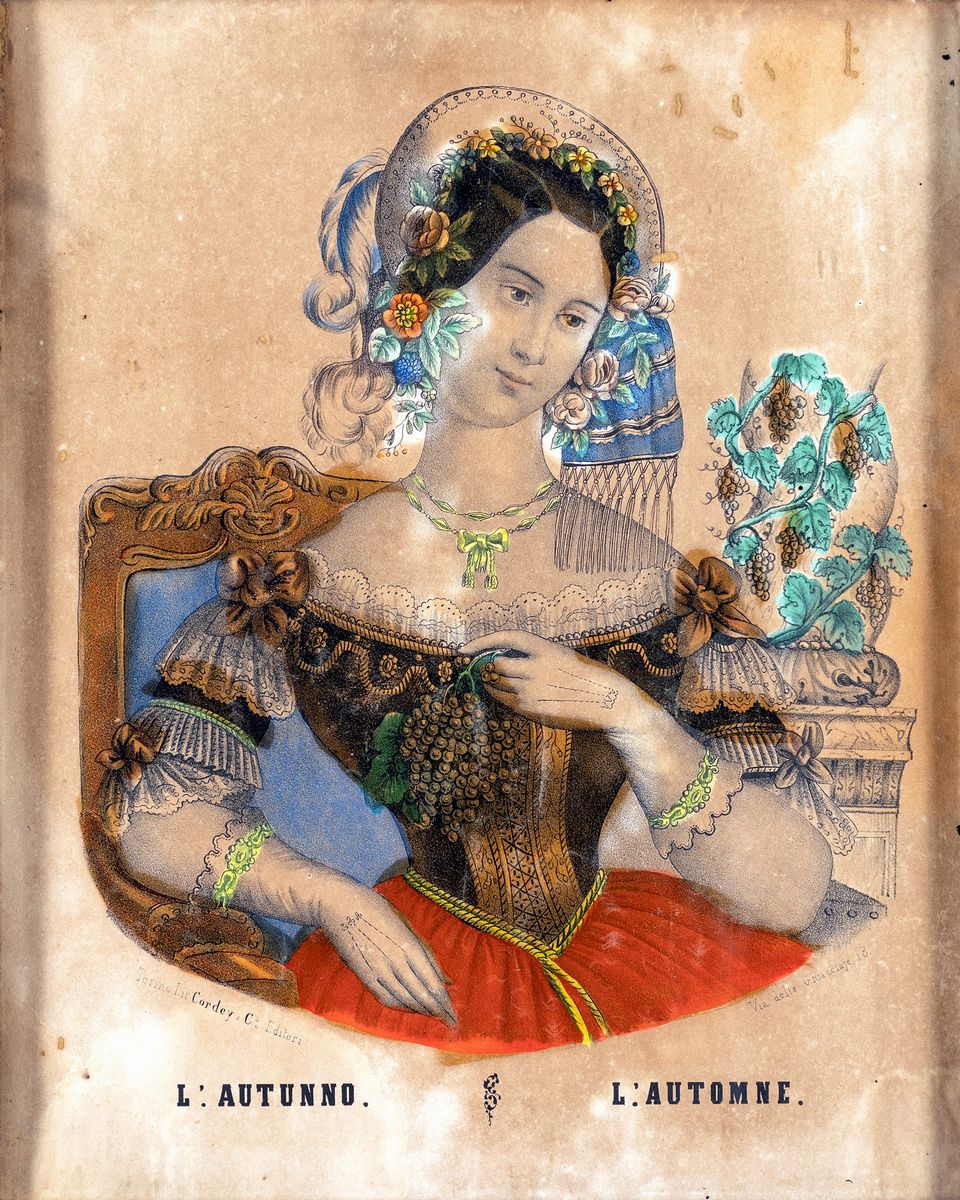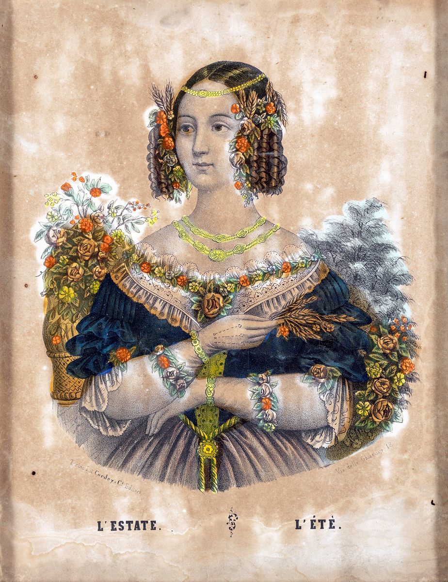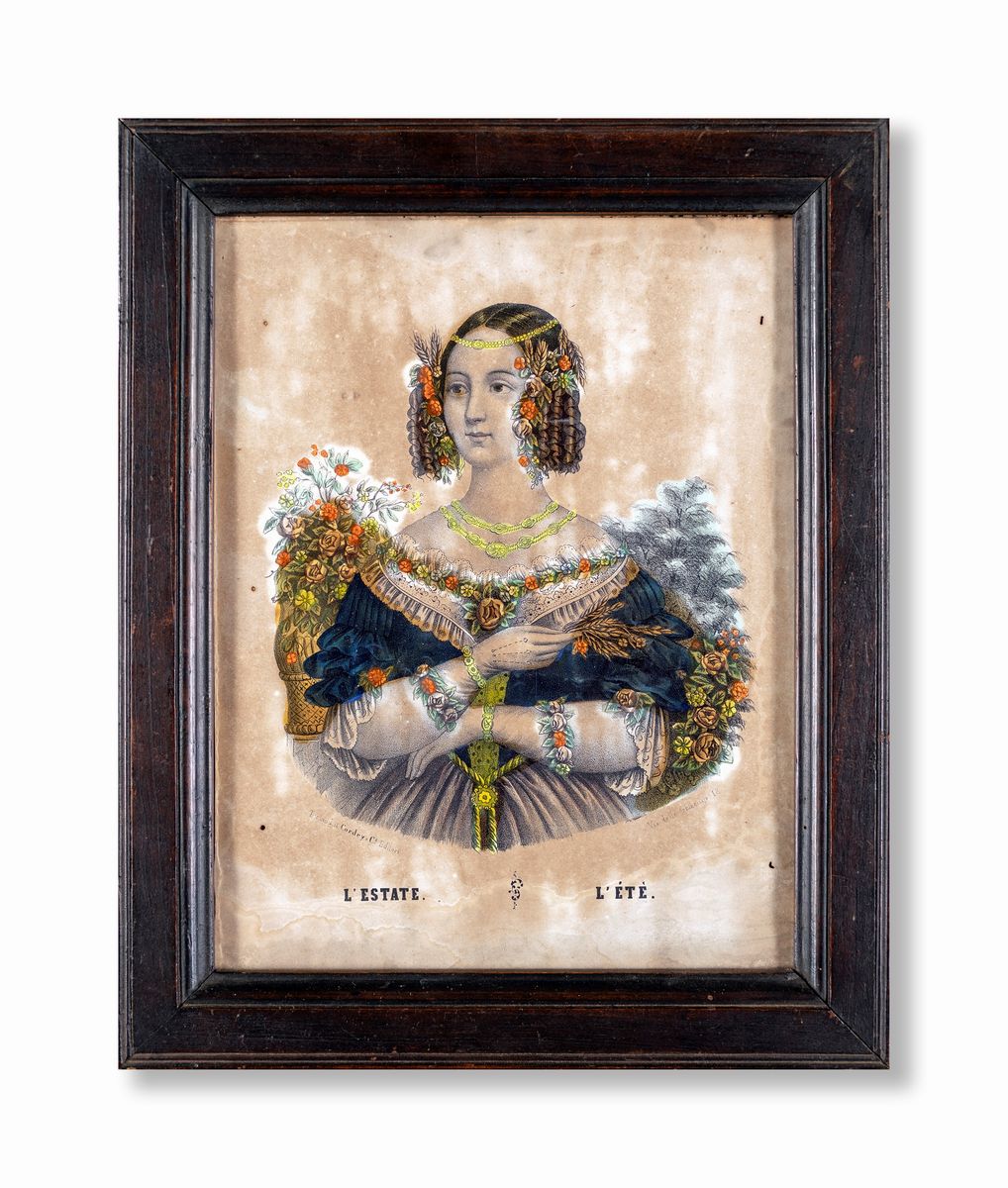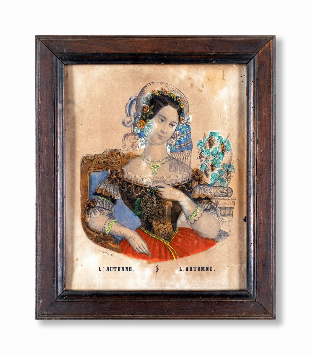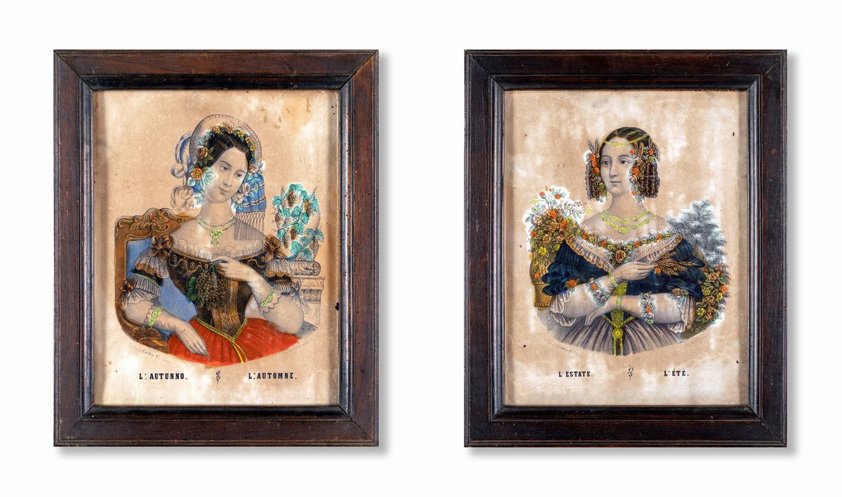 raffiguranti allegoria dell'Estate e dell'Autunno rappresentate da giovani donne ritratte con i rispettivi attributi allegorici. Cornici in legno naturale.