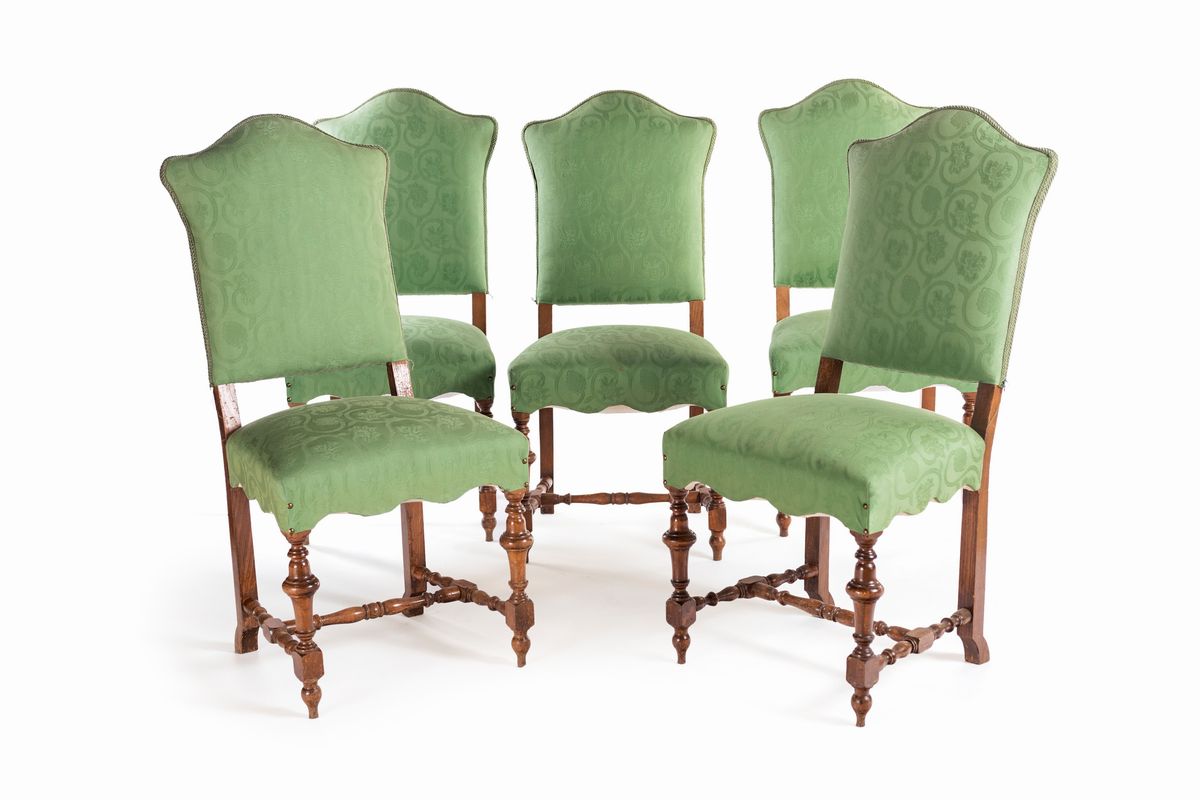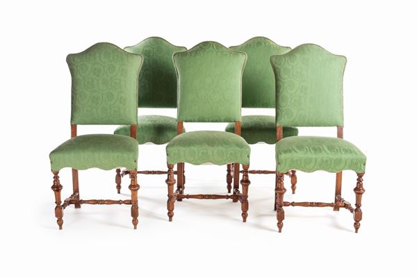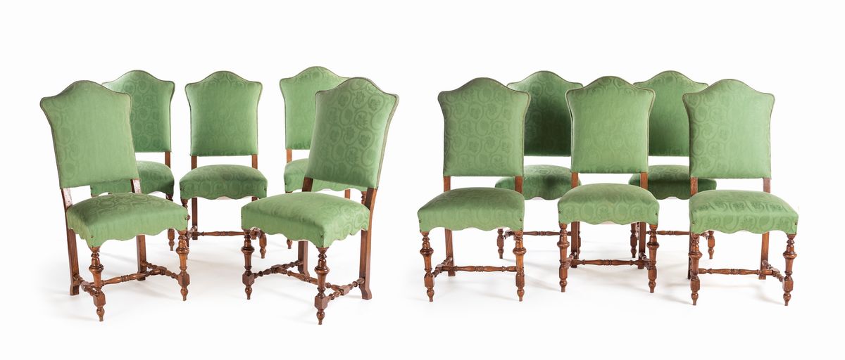 di gusto seicentesco, con alti schienali sagomati e sedili rivestiti in tessuto verde, completate da housse in cotone giallo; gambe tornite riunite da traverse