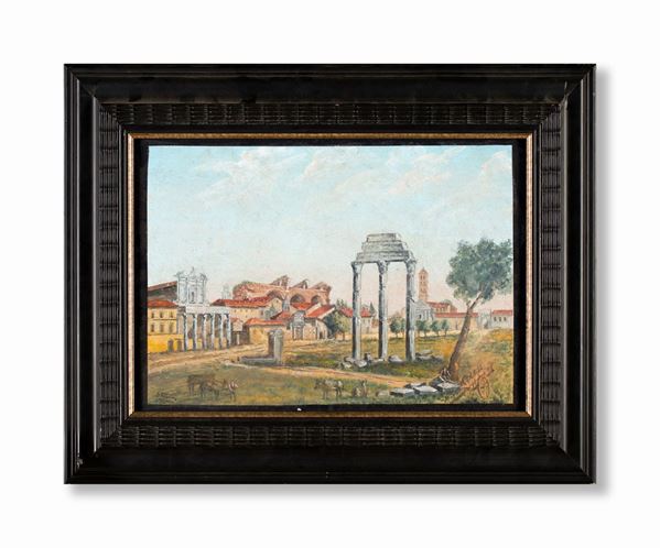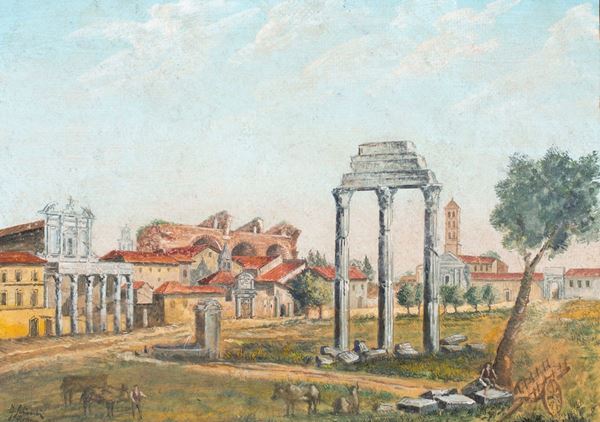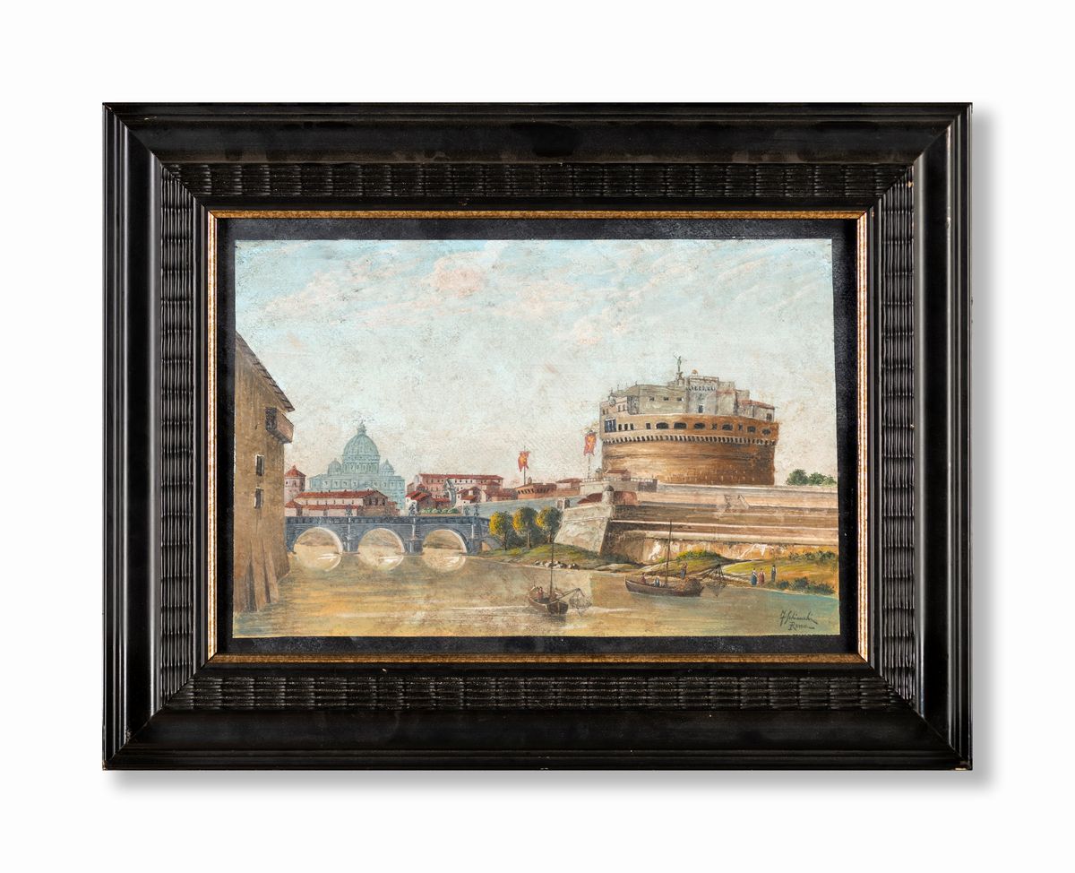 a) Il Tevere e Castel Sant'Angelo b) Veduta delle tre colonne del tempio dei Dioscuri al Foro con la chiesa di San Lorenzo in Miranda e il complesso ecclesiastico dei SS. Cosma e Damiano