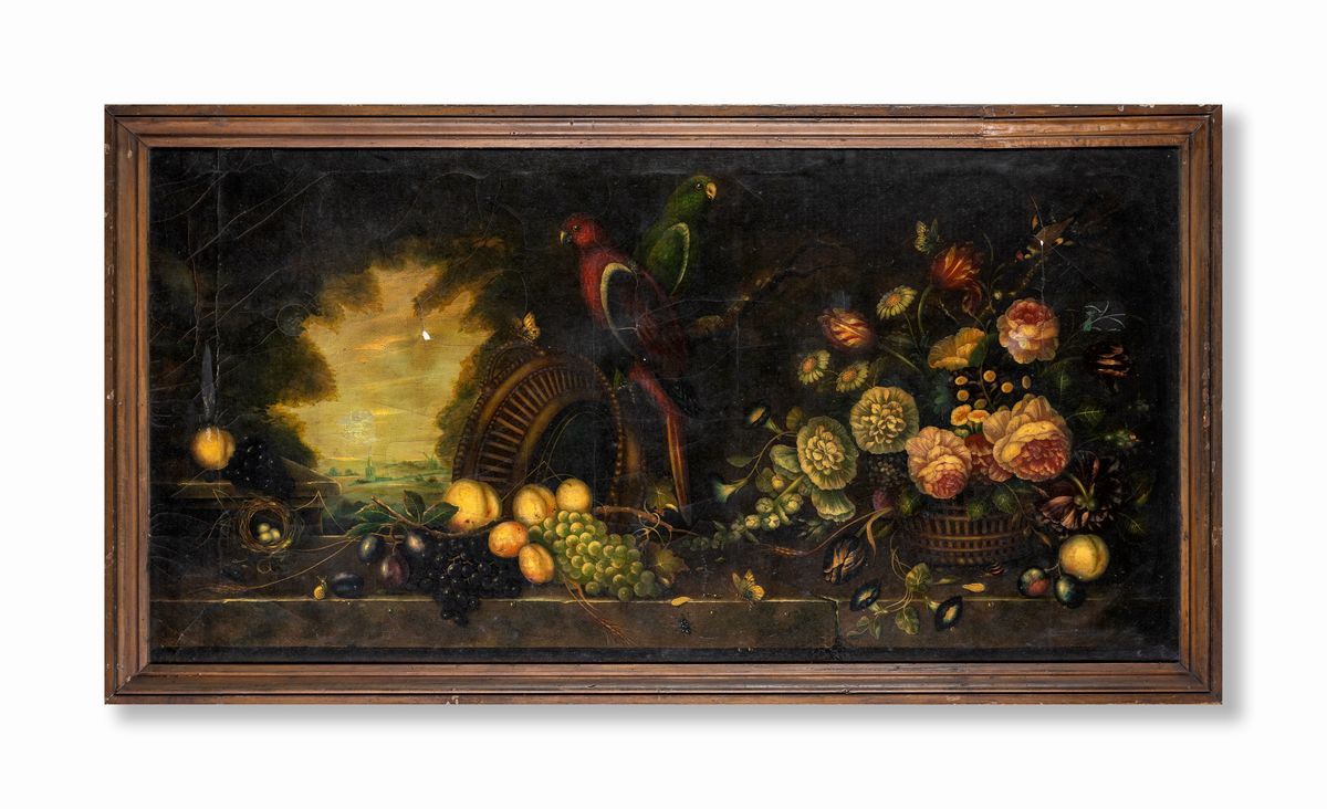 Natura morta di fiori e frutta con paesaggio in lontananza