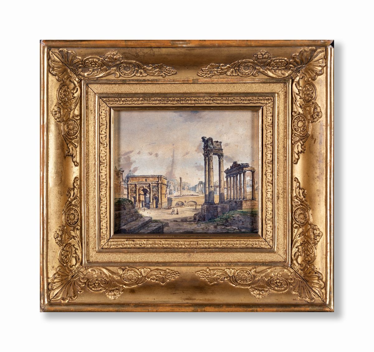 Veduta del Foro Romano con l'Arco di Settimio Severo e i resti del tempio di Vespasiano e Tito e del tempio di Saturno