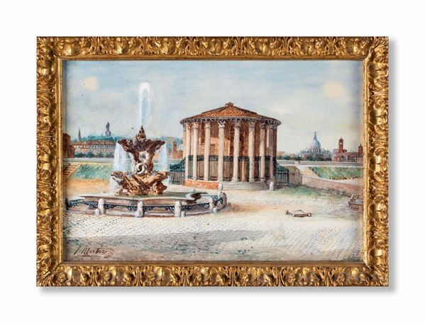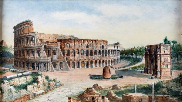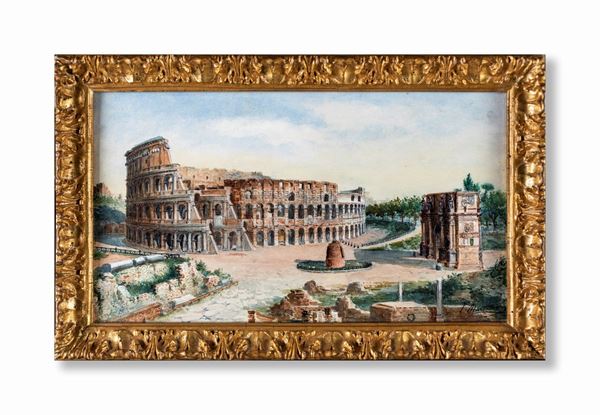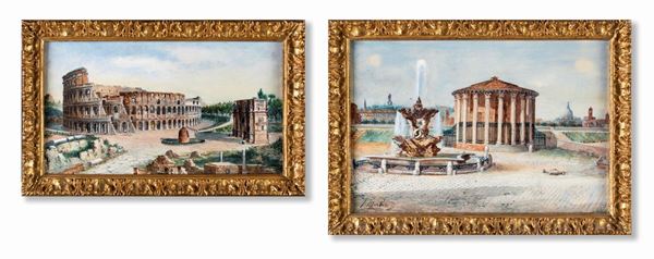 a) Veduta del Colosseo con l'Arco di Costantino e la Meta Sudans b) Il Tempio di Ercole vincitore al Foro Boario e la fontana dei Tritoni di Carlo Bizzaccheri