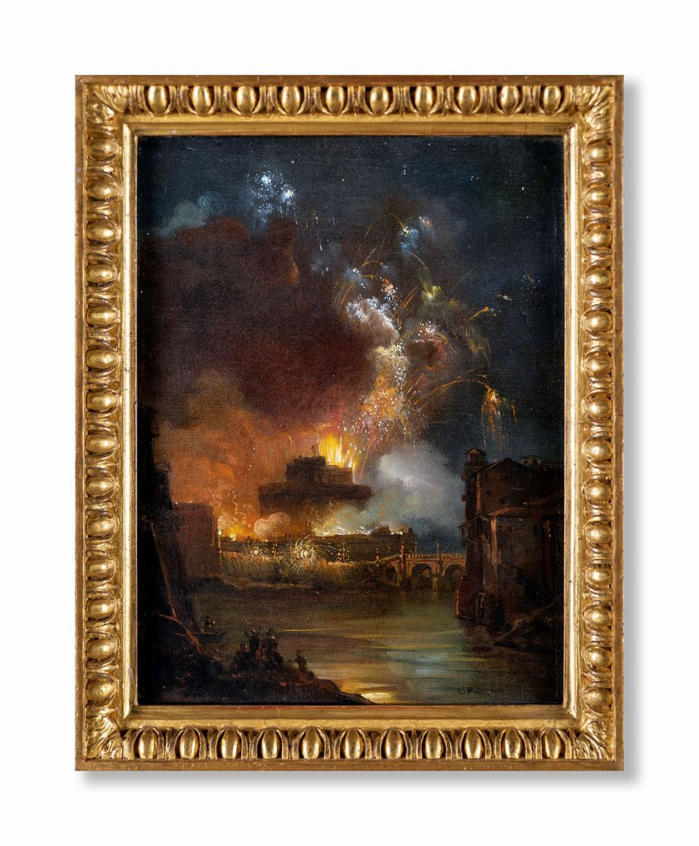 Siglato in basso a destra: C.P. Lo spettacolo pirotecnico ha origine intorno al Seicento, ideato da Michelangelo Buonarroti per i festeggiamenti dei santi Pietro e Paolo fondatori della Chiesa e patroni di Roma. Venne interrotto nel 1886 dalle autorità italiane che lo ritennero troppo pericoloso.