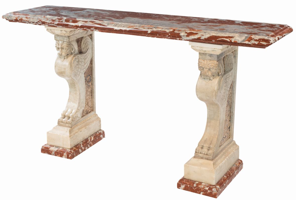 costituite da due antichi mensoloni in marmo bianco statuario del XVIII secolo, scolpiti con figure ferine ed impreziositi ai lati da inserti in lumachello, su cui poggia uno spesso piano rettangolare in marmo rosso di Francia con ciglio spiovente e profilo sottostante modanato