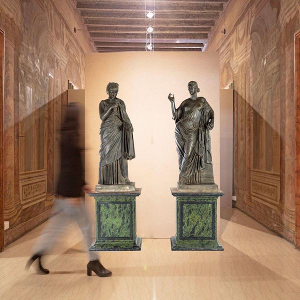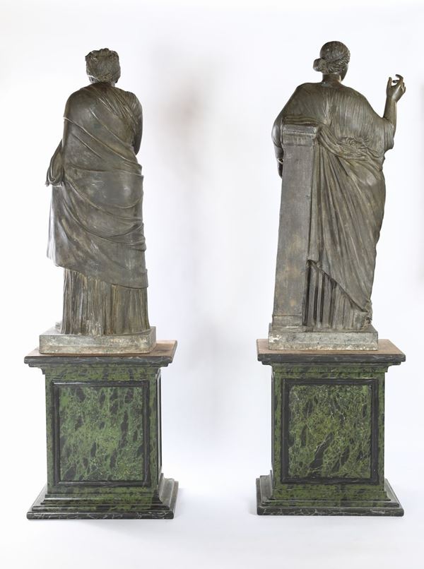 desunte dal repertorio classico, stanti su piedistalli squadrati in legno dipinto ad imitazione del marmo verde. Recano un'etichetta lungo il profilo laterale della base con iscritto Miroy Frères Paris. I Miroy Freres, noti in particolare per i loro bronzi e orologi, erano un'azienda a conduzione familiare che lavorò a Parigi per un paio di generazioni. Difetti.