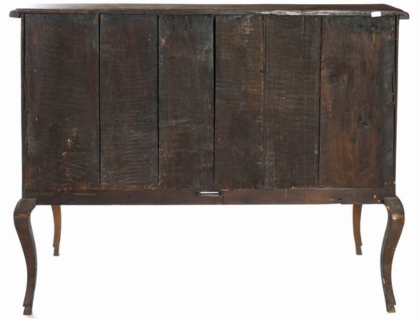 di forma rettangolare con protomi zoomorfe ai lati e piedi ferini; facciata decorata da placca con figure allegoriche in bassorilievo con iscrizione a caratteri greci e monogramma in basso a destra: E.H.SC. Dettagli e rilievi ornamentali lumeggiati in oro completano la descrizione.