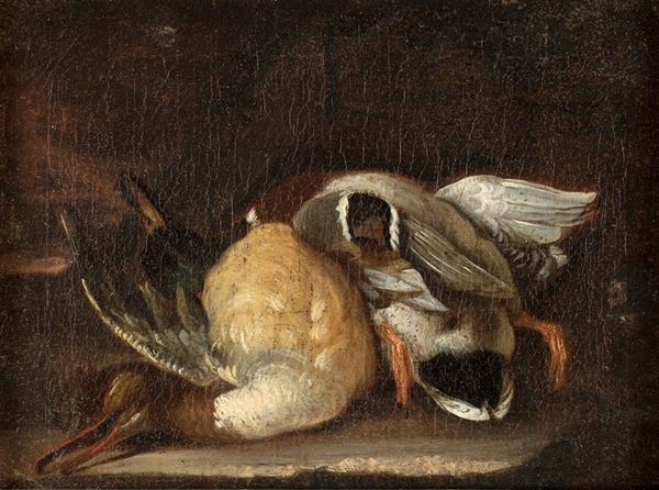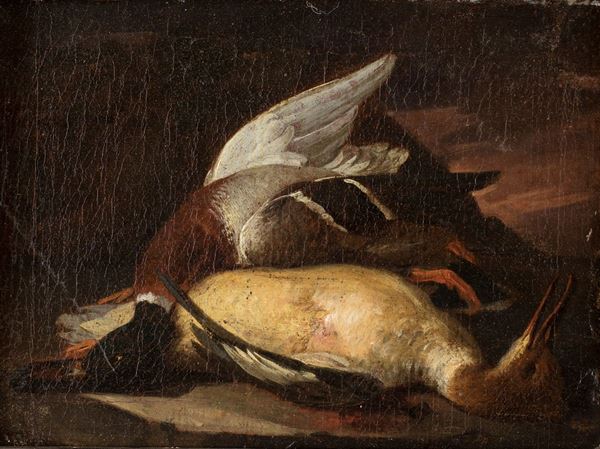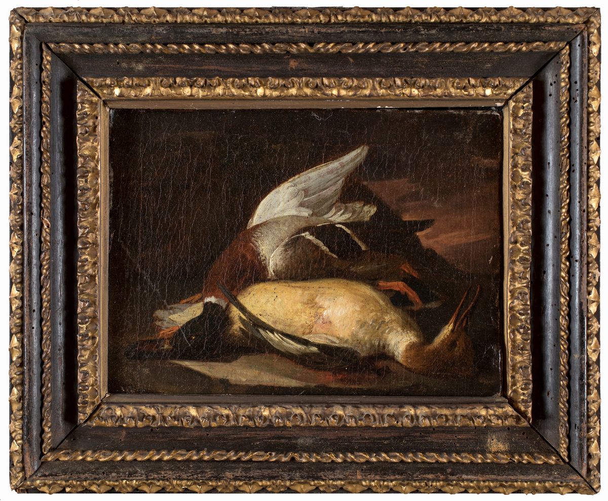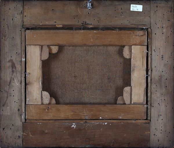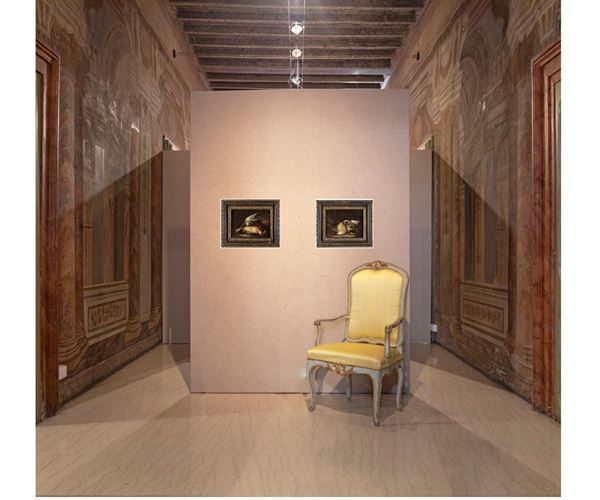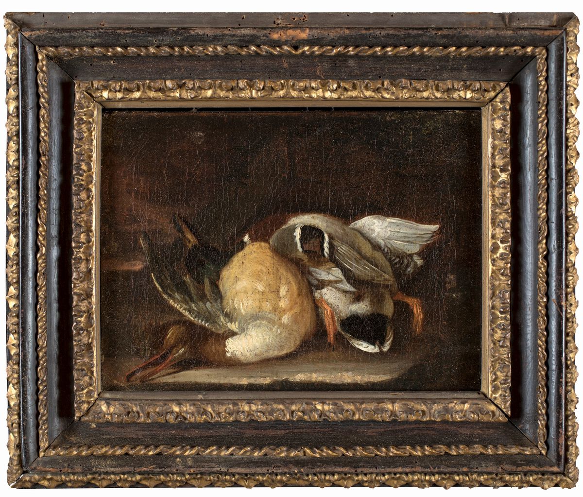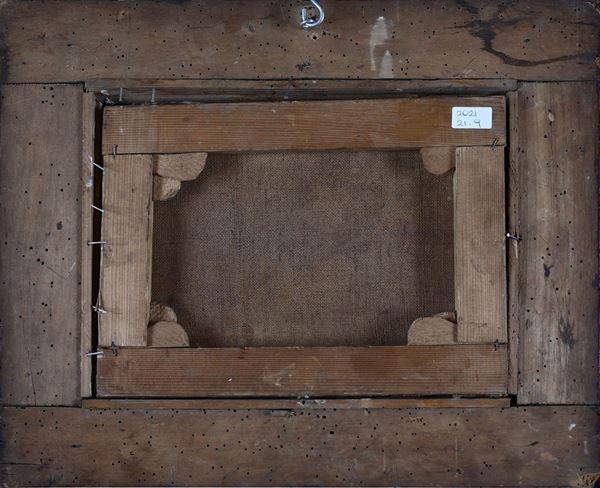 Entro cornici modanate in legno ebanizzato con intagli dorati