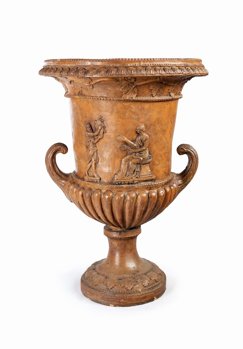 con figure in rilievo e brevi anse ricurve; all'interno vasca in tolla