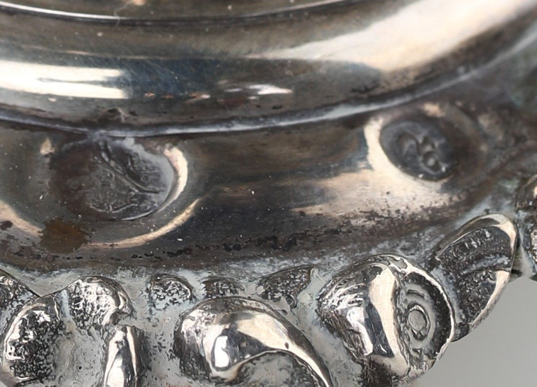con superficie decorata a scaglie su cui emergono bouquets incisi incorniciati da motivo a nastro curvilineo; profilo superiore ondulato sottolineato da sottile cordoncino; piede circolare lobato sorretto da volute vegetali
