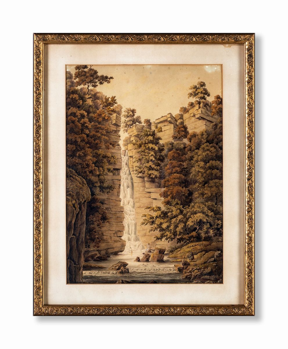 Cascata di Cavagrande del Cassibile nella Sicilia orientale con pittore al cavalletto e ninfe