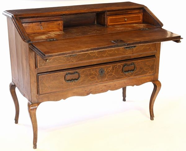 con filettature intarsiate in legno di frutto ad andamento lineare poste a cornice di tarsie sagomate ad andamento mistilineo terminanti con motivi vegetali; poggiante su gambe mosse, reca due cassetti frontali con maniglie in bronzo e due tiretti all'interno della ribalta