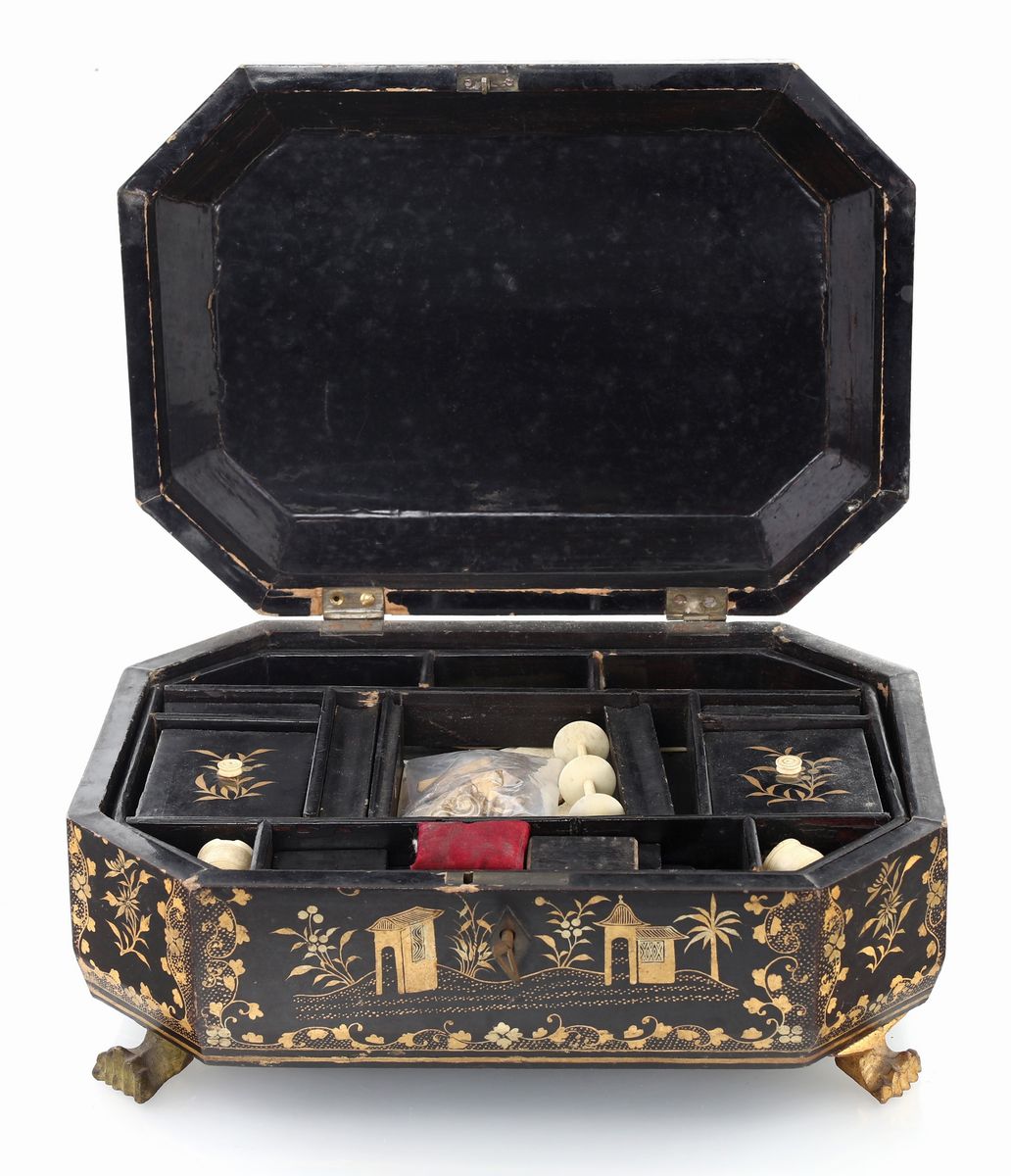 decorata a chinoiséries dorate; di forma rettangolare con spigoli tronchi e coperchio semi bombato incernierato, reca all'interno un ripiano mobile suddiviso in scomparti con rocchetti e utensili per cucito in avorio. Un piedino mancante