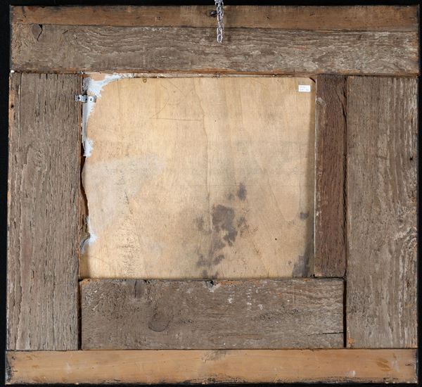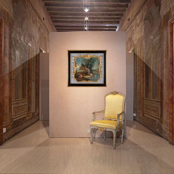 raffigurante un paesaggio con scena galante entro specchiatura sagomata racchiusa da profilo modanato e dorato, inclusa in un pannello rettangolare con cornice ebanizzata