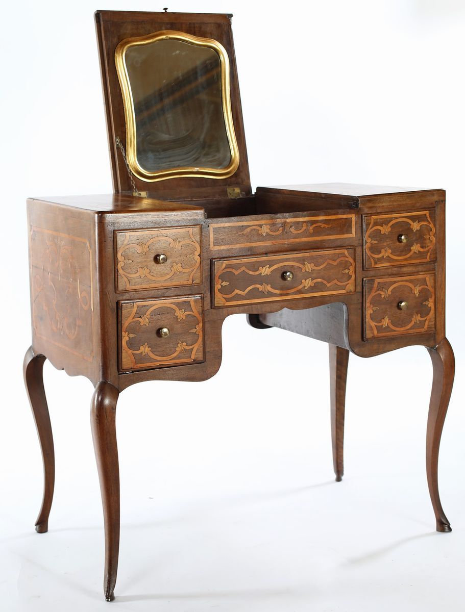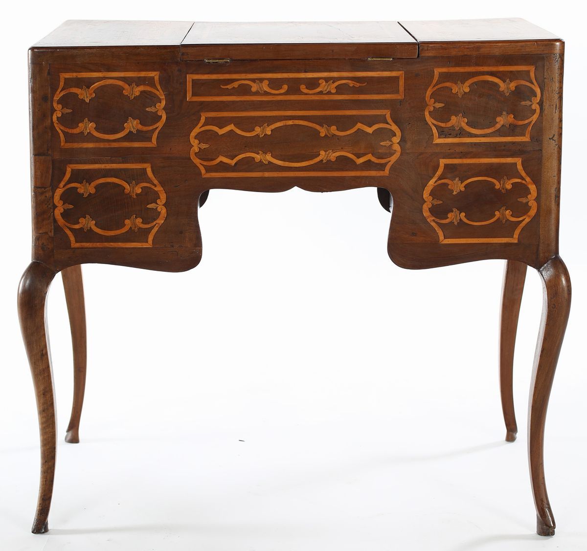 di gusto settecentesco, intarsiata in legno di frutto a volute poste a cornice delle varie partizioni. Sorretta da gambe sagomate, reca cassetti frontali e piano con sezione centrale apribile con specchio al verso racchiuso da cornice in lego dorato