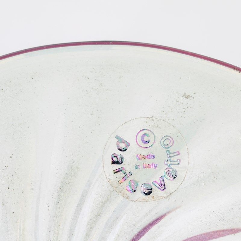 Alzata in vetro borosilicato soffiato, con piede circolare a spirali e sostegno affusolato su cui posa il piatto di forma circolare piana, cm 18,5x18,3 Reca bollino adesivo della manifattura Paris e Vetro, fondata a Marostica (VI) all'inizio degli Anni Settanta del Novecento.