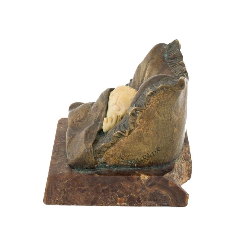crisoelefantina in bronzo raffigurante la parte superiore di un letto in cui riposa un bimbo di cui sporge unicamente il volto in avorio. Basso supporto in marmo con piccola mancanza ad un angolo. Firmato Lequesne.