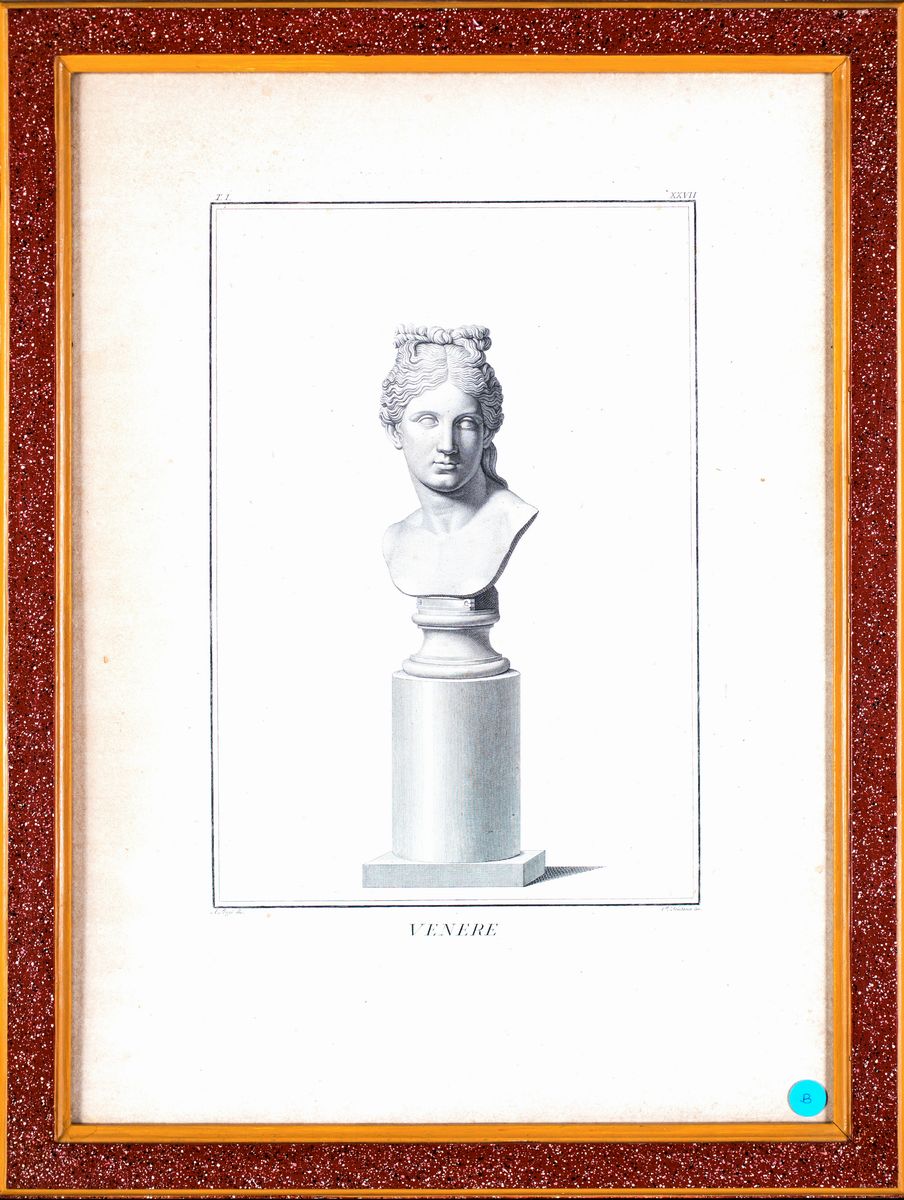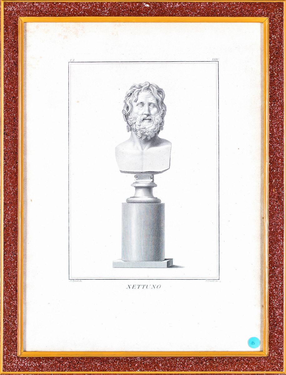 la prima incisa da Pietro Fontana (Bassano del Grappa 1762 - Roma 1837) su disegno di Francesco Pozzi (Roma 1750 - 1805); la seconda incisa da Bernardino Consorti (Ascoli Piceno 1780 ca. - 1859) su disegno di Luigi Agricola (Roma 1750 ca. - 1821) Cornici in legno marmorizzato ad imitazione del porfido con profili dorati