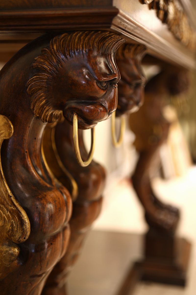 caratterizzata da doppie figure di grifo scolpite a tutto tondo come sostegni frontali cui corrispondono pilastri posteriori riuniti da una traversa sagomata centrata da palmetta in rilievo; piano in marmo bianco sormontato da un'alta specchiera delimitata da colonne scanalate appaiate disposte ai lati; rilievi ornamentali minuziosamente resi ad intaglio e dorati completano la descrizione