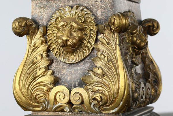 bracci sagomati emergenti da un vaso posto sulla sommità di una colonna con fusto scannellato calzata in un cespo fogliaceo; piedistallo decorato da mascheroni leonini e rilievi vegetali angolari minuziosamente resi