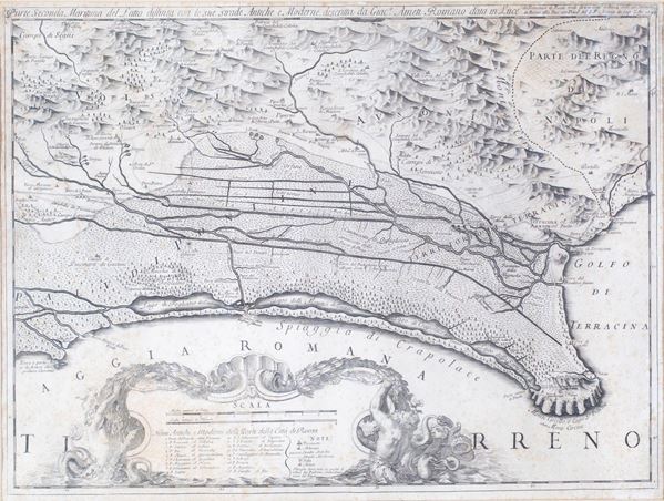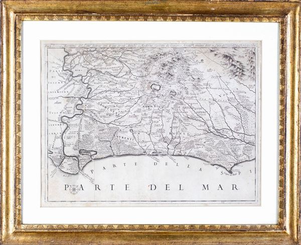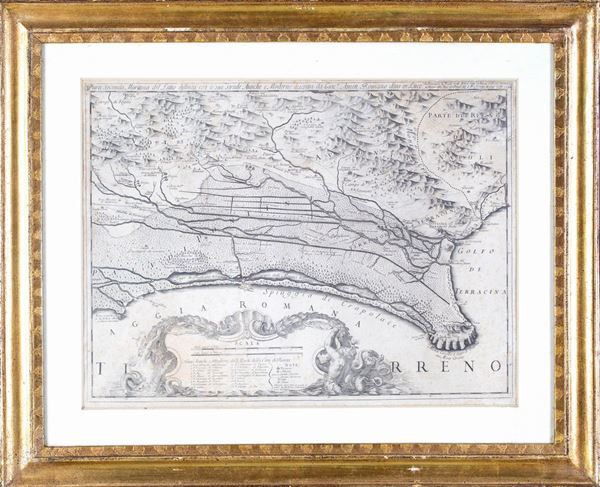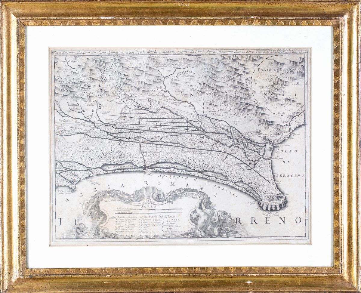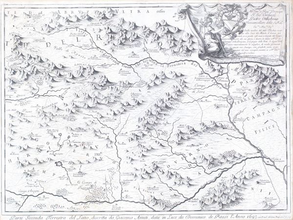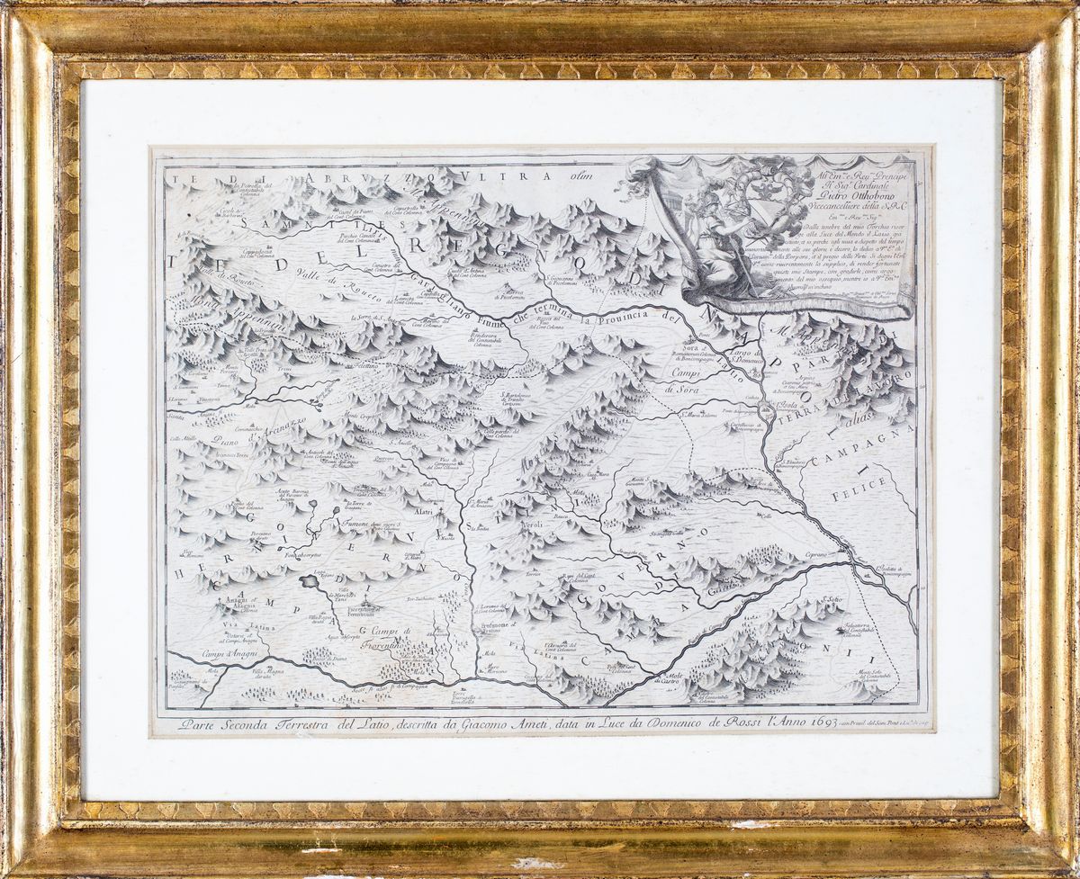 "Parte prima terrestre'', ''Parte seconda terrestre'', ''Parte prima marittima'', ''Parte seconda marittima''. Quattro carte geografiche originali tratte dal "Mercurio Geografico", atlante pubblicato a Roma dalla stamperia De Rossi a partire dal 1669 basate sulle relazioni del cartografo Giacomo Cantelli da Vignola. Titolo entro cartiglio con stemma nell'angolo in alto a sinistra, altro cartiglio con stemma nell'angolo in alto a destra, dedica al Cardinale Ottobono. Scala delle miglia e leghe ed elenco delle porte della città di Roma impressa entro ricca cornice nella parte inferiore destra.