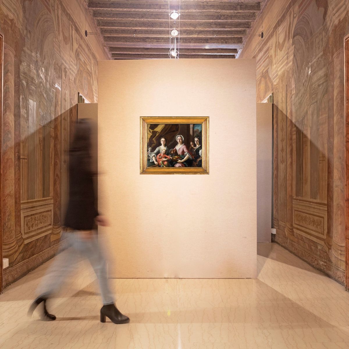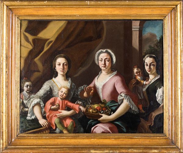 In questo dipinto, databile alla fine degli Anni Trenta del Settecento per affinità con i ritratti di gruppo eseguiti da Giuseppe Bonito, il pittore è riuscito ad amalgamare i caratteri celebrativi della ritrattistica al gusto legato alla pittura di genere. La sintesi di questi due aspetti si coglie nella figura femminile posta al centro della composizione, resa con particolare realismo nell'atto di offrire un frutto scelto dalla cesta che tiene in grembo.