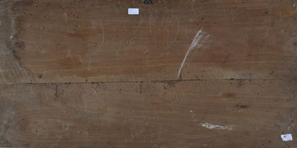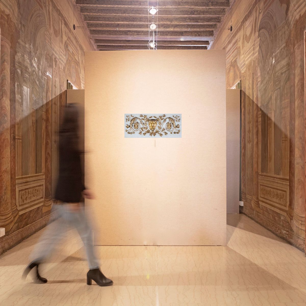 centrato da un mascherone in bassorilievo sospeso fra tralci di quercia da cui si dipartono girali fiorite