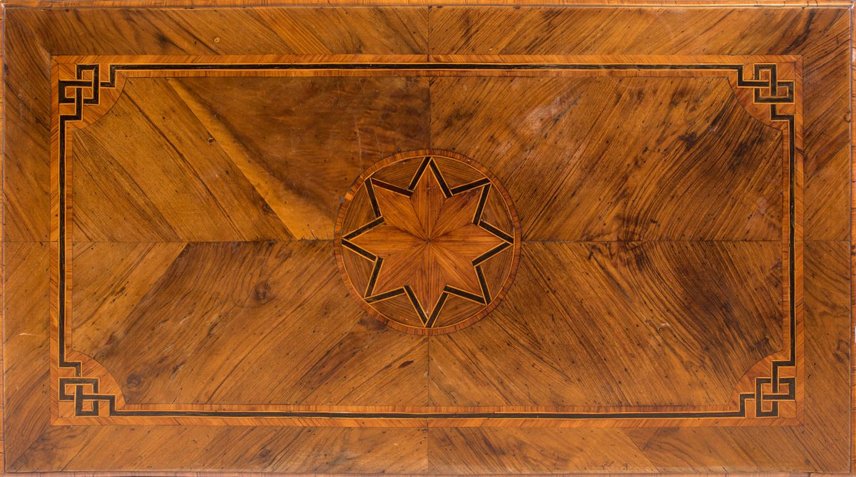 con piano rettangolare racchiuso da filettatura con intrecci angolari in legno di frutto naturale e tinto, centrato da stella intarsiata racchiusa entro medaglione circolare; due cassetti in linea nella fascia, gambe mosse