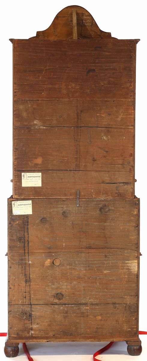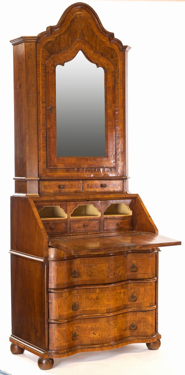 corpo superiore con cimasa a timpano arcuato, uno sportello a specchio e due tiretti in linea nella fascia; corpo inferiore con facciata lievemente sagomata suddivisa in tre cassetti e un'anta a ribalta con tre scomparti e tre tiretti all'interno; piedi a sfera