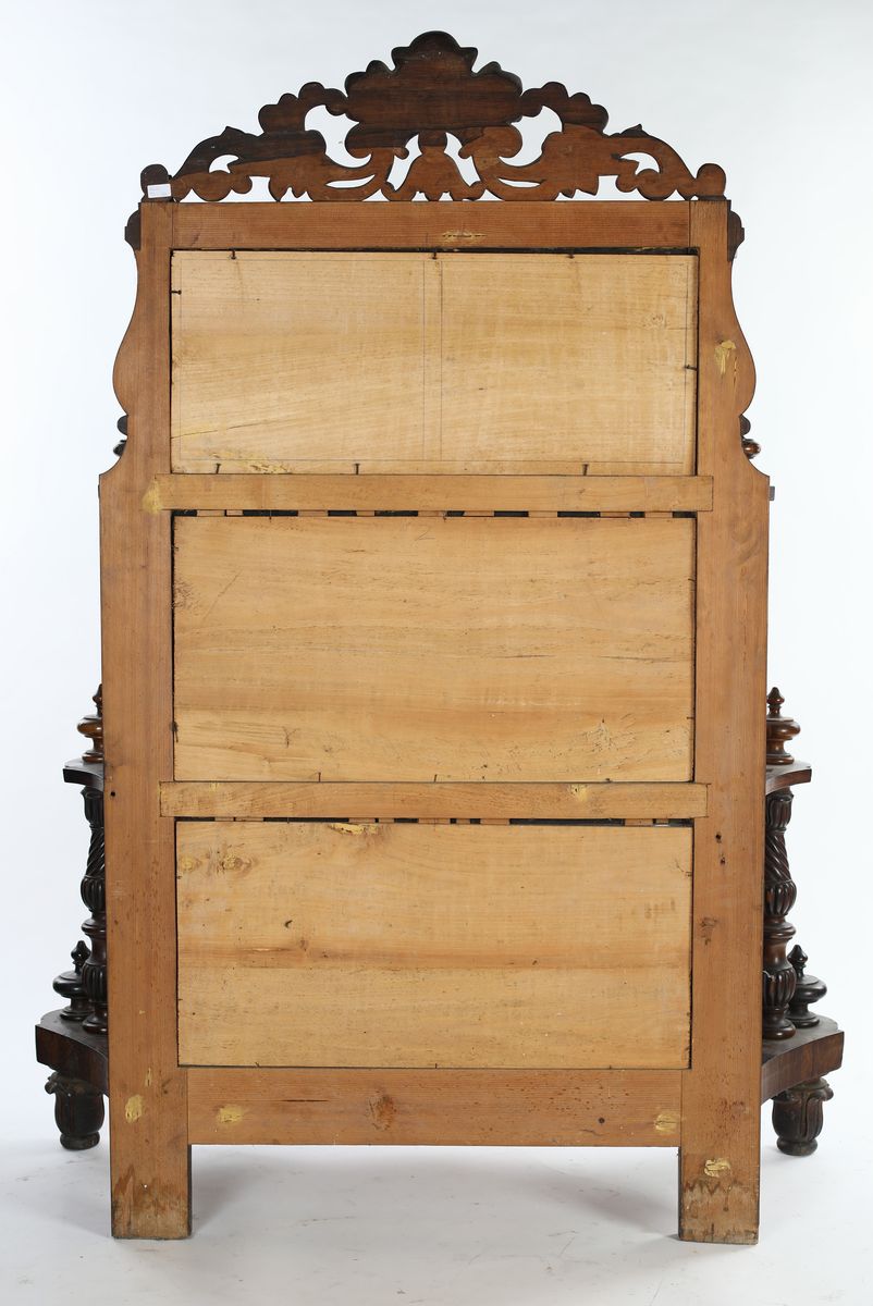 con pannello posteriore a specchio e quattro piani a scalare di linea sagomata sorretti da montanti torniti; profilo superiore definito da rilievi vegetali intagliati