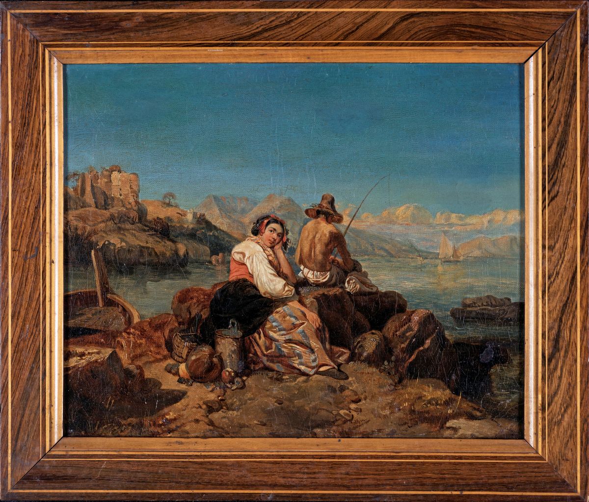 Paesaggio ligure con pescatore e figura femminile in abito tradizionale