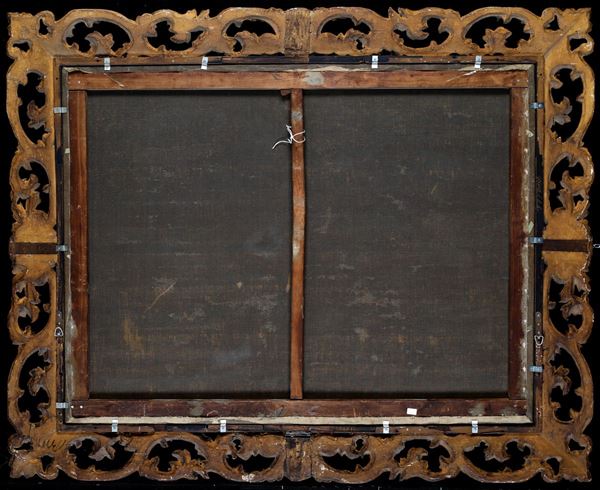 Cornice in legno intagliato e dorato a volute e motivi vegetali