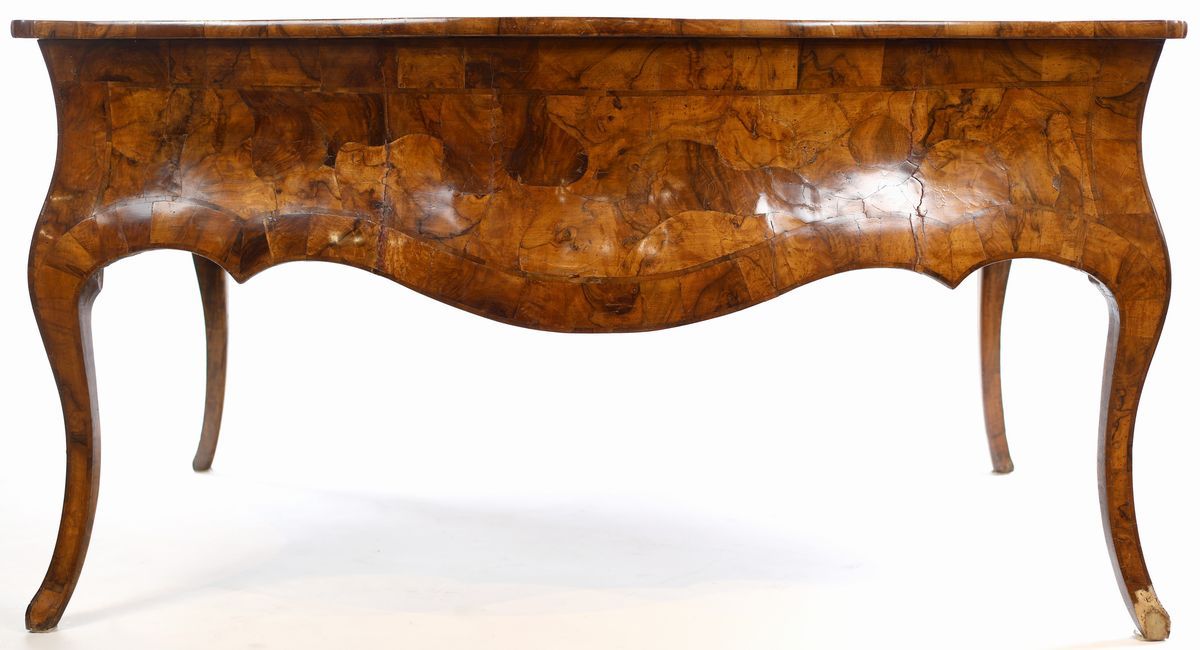 di gusto settecentesco con piano fortemente sagomato, un cassetto al centro della fascia affiancato da due in colonna disposti ai lati, gambe mosse. Piccola mancanza all'estremità di un piede