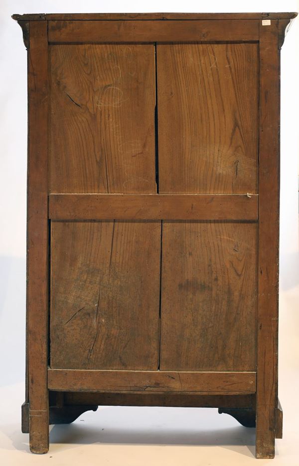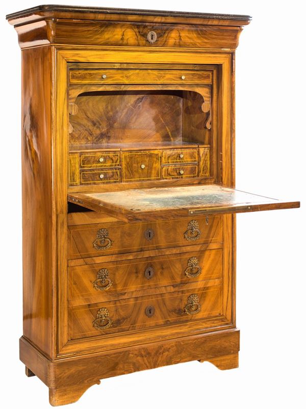 Rifinito superiormente da piano in marmo nero, reca facciata scandita da un cassetto, un'anta a ribalta e tre cassetti nella parte inferiore con maniglie in bronzo; all'interno della ribalta un lungo cassetto, un ampio vano con un tiretto centrale affiancato da due in colonna disposti ai lati; piedi a bulbo.