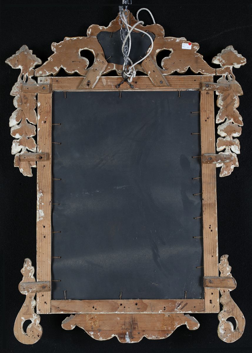 con cornice modanata a due ordini di intaglio sormontata da cartiglio specchiato affiancato da volute vegetali da cui si diramano brevi cascatelle fiorite; profilo inferiore centrato da cartiglio, sostegni sagomati terminanti a ricciolo